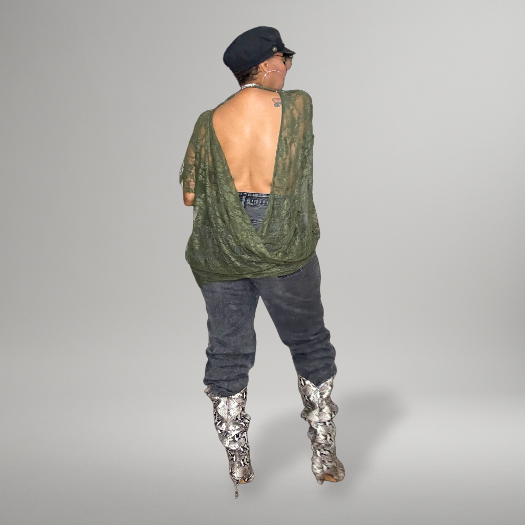 The “Almost Doesn’t Count” Reconstructed Tee redefines what effortless street style looks like. Gaynelle took a classic graphic tee and transformed it by removing the back and replacing it with draped sheer lace, creating a deep, plunging silhouette that’s equal parts bold and feminine. The front stays rooted in streetwear energy, while the back steals the show with soft, romantic transparency.