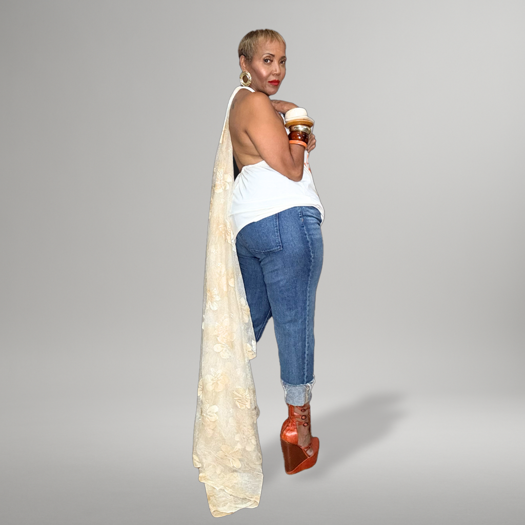 The “Soft Power” Reconstructed Tee takes a classic graphic top and transforms it into a feminine, fashion-forward halter silhouette. Gaynelle removed the back, reshaping the neckline into a flattering halter cut, then added an elongated floral lace train that cascades down the back for a touch of unexpected elegance. The result: a perfect collision of streetwear and softness—bold from the front, breathtaking from the back.