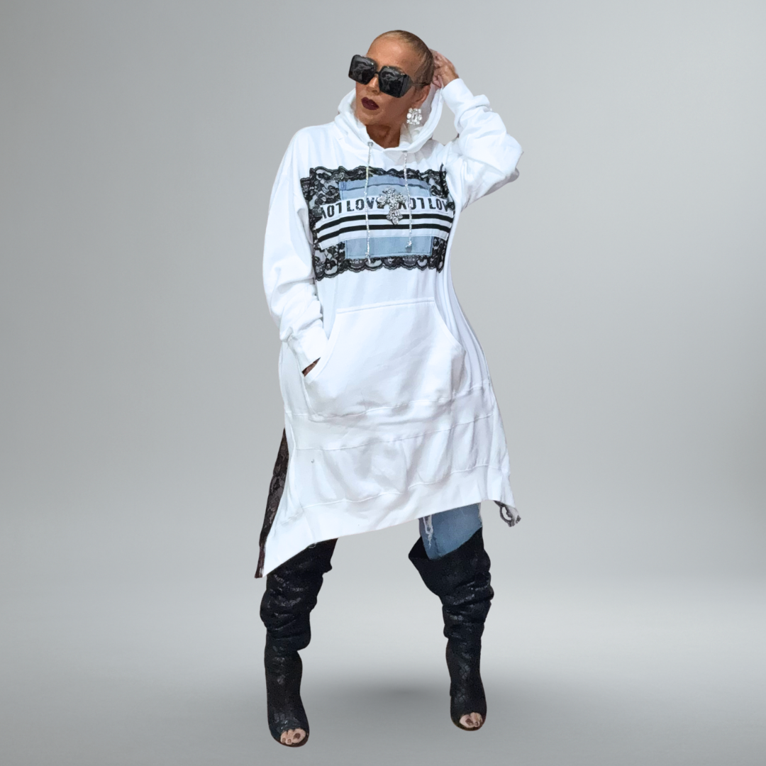 Love is the real statement piece. The Double Crossed hoodie dress blends softness and strength with reconstructed denim, black lace, and a jeweled cross that reminds you—real love is layered, tested, and still stands bold. Designed for the woman who leads with her heart but never loses her edge.