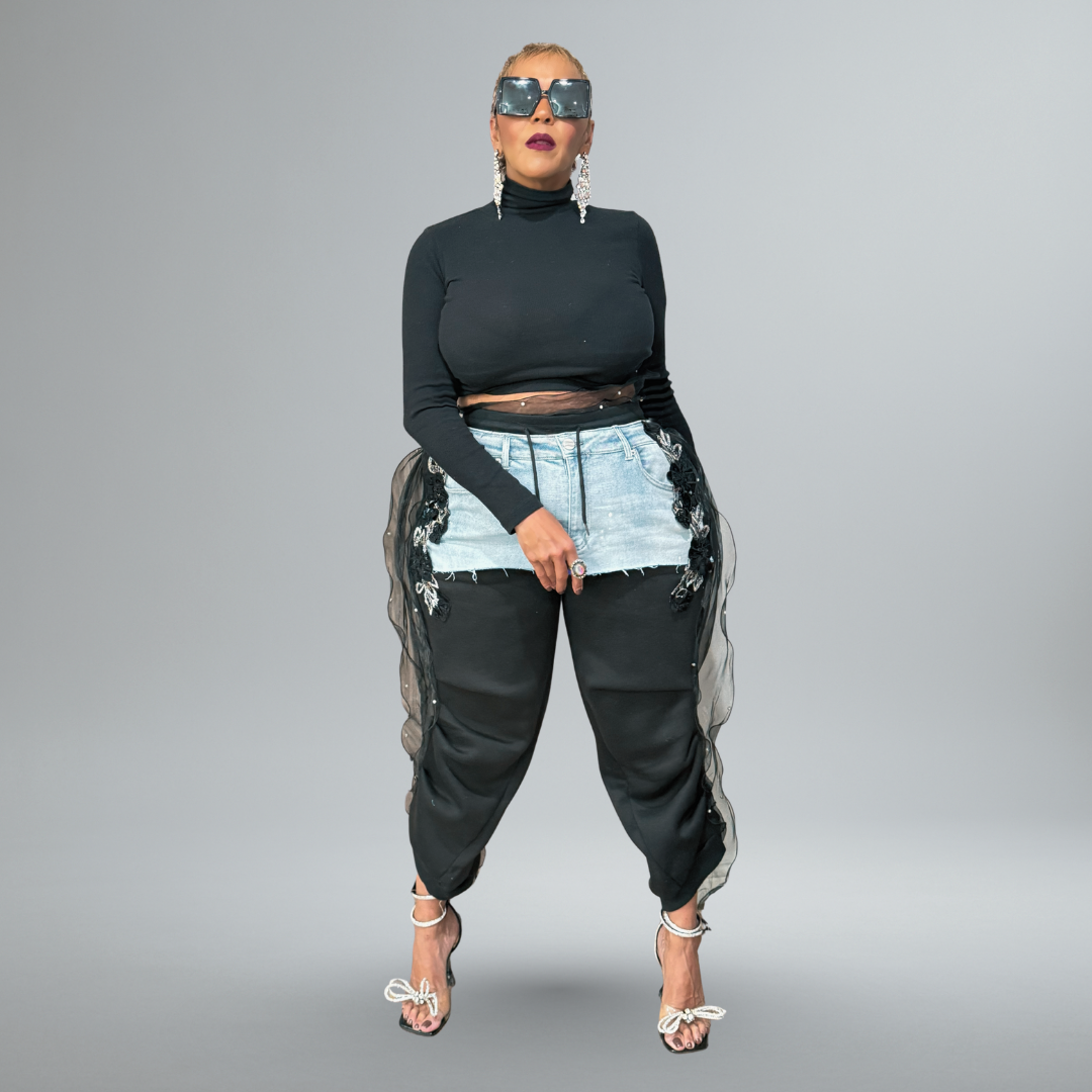 Soft meets savage. The Guns and Roses pants fuse distressed denim, black florals, and sheer tulle for a look that’s equal parts beauty and grit. Reconstructed from denim cutoffs with dramatic lace appliqué and flowing mesh sides — this piece walks the line between feminine and fearless. A reminder that power can bloom from the toughest places.