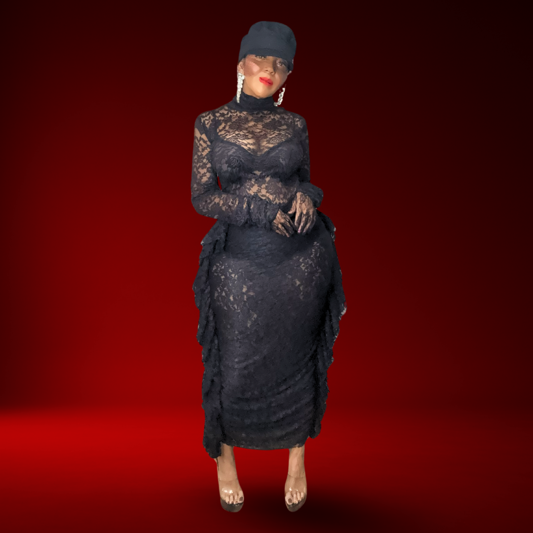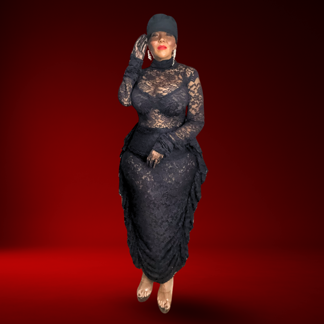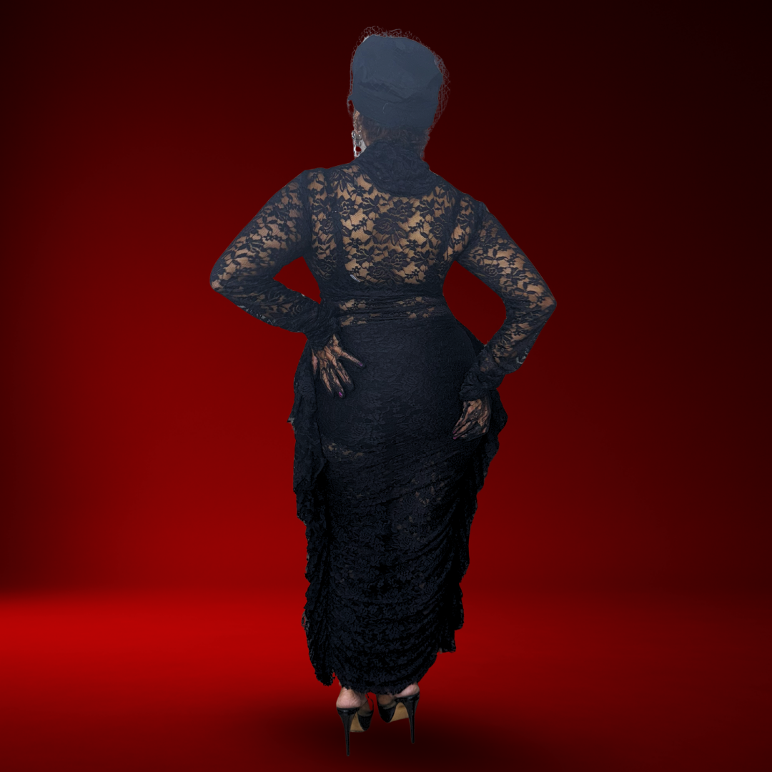 STELLA drapes the body in sculpted black lace, blending softness and seduction with a fit that celebrates every curve. High neck, long sleeves, and a ruched lace skirt create a silhouette that whispers mystery while owning the room in full volume.